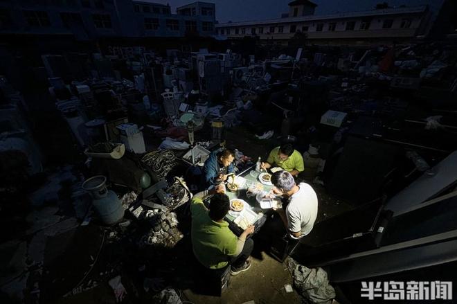 2024年7月13日,晚8时许,忙碌一天的回收家电工人在废旧家电旁吃晚饭